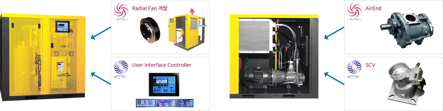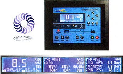 세계 최고의 기술력을 보유한 국내의 유명 제조사와 함께 당사 기술진이 공동 개발한 Mega Control-2 Module은 견고한 산업용 컴퓨터를 기반으로 합니다. 콤프레샤 시스템을 자동으로 제어하고, 실시간으로 작동상태를 점검하고 업데이트 합니다. 설정 압력에 따라 자동으로 부하운전(loading), 무부하운전(unloading)이 이루어지고 운전모드 선택에 따라 예약운전이나 원격운전이 가능하여 사용자가 편리하게 이용할 수 있습니다. 콤프레샤의 작동상태를 액정화면(LCD)을 통해서 소비전력, 전압, 전류 등을 문자, 숫자, 기호의 형태로 소비자들이 이해하기 쉽도록 간결하게 표시되며, 가동 중 문제(Fault) 발생시 경보메세지를 한글로 표시하고 이 경보메세지에 대한 이력을 저장함으로써 발생된 문제에 대한 내용을 확인하고 조치할 수 있습니다.