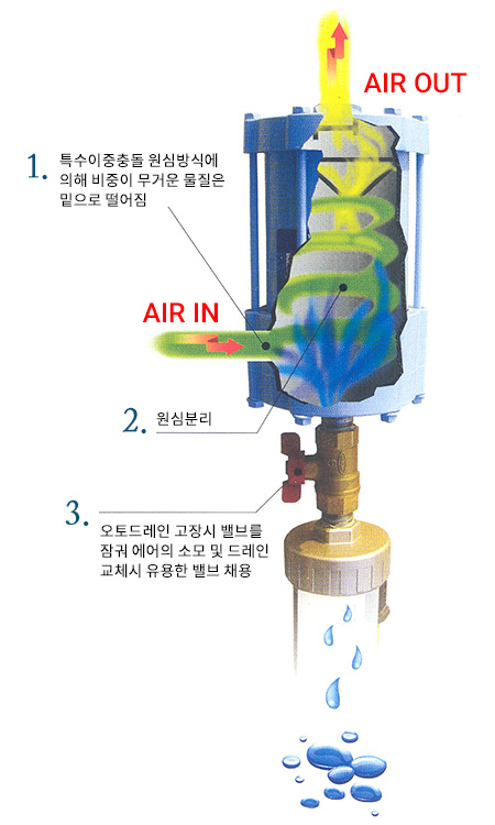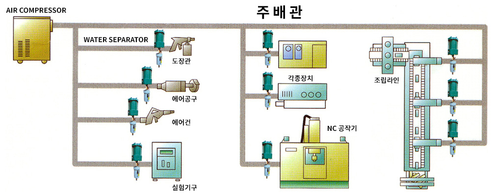 압축공기에 포함되어 있는 수분 및 기타 불순물은 공압기기 및 기타 사용처에 중대한 해를 입히거나 제품 불량을 일으키는 원인을 초래합니다. 이런 이유 때문에 Water Separator를 설치하여 문제를 해결하고 사용 목적에 맞는 에어를 지속적으로 공급하기 위함입니다.